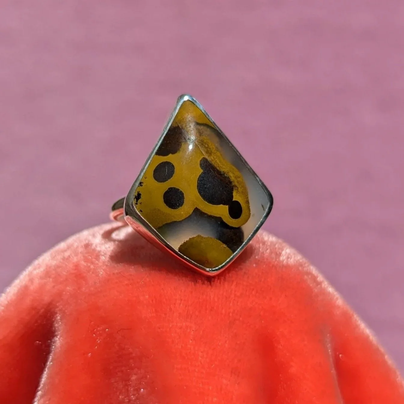 sterling silver ring featuring a large kite shaped polka dot agate from oregon