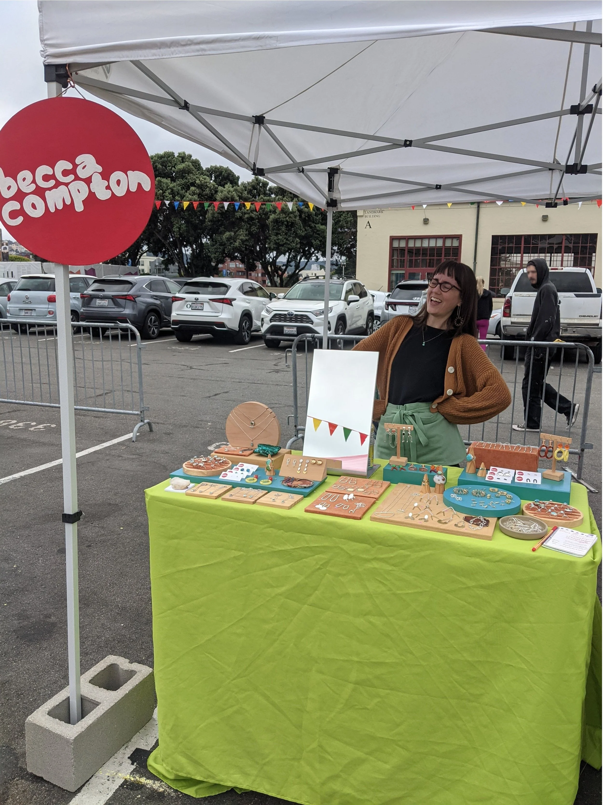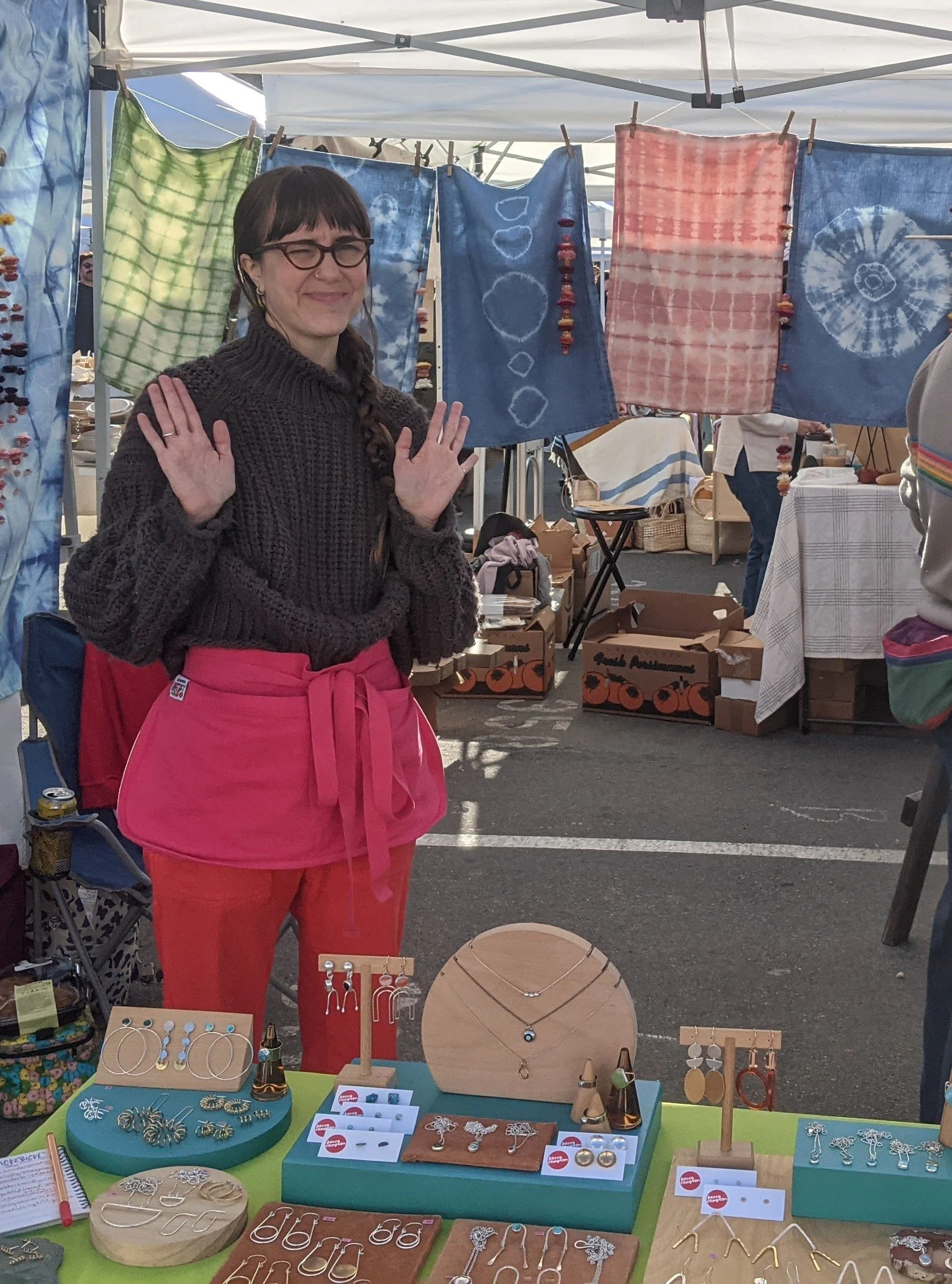 hello, this is becca, the human that runs this jewelry biz. here they are, posing behind their booth/display at various outdoor markets held in parking lots. becca doesn’t love being in front of the camera and is rather shy, but they try their best!
